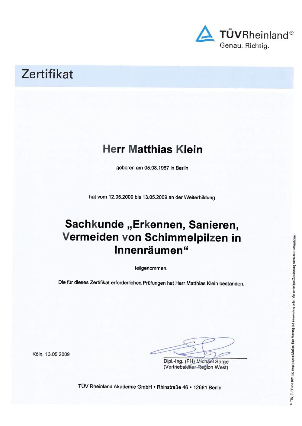 Matthias Klein ist zertifiziert in den Bereichen Schimmelprävention und -behandlung (TÜV Berlin).